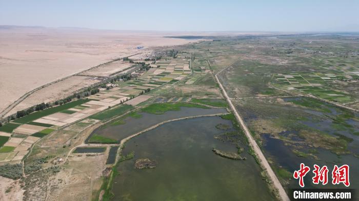 5月27日,位于甘肃张掖市高台县黑河湿地保护区的荒漠与湿地共生共美。该保护区南依祁连山国家级自然保护区,北靠巴丹吉林沙漠,处于河西走廊“蜂腰”地带,是中国西北地区自然保护区网络的重要节点。图为湿地生态美景入画来。(无人机图片) 戴文昌 摄