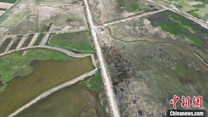 5月27日,位于甘肃张掖市高台县黑河湿地保护区的荒漠与湿地共生共美。该保护区南依祁连山国家级自然保护区,北靠巴丹吉林沙漠,处于河西走廊“蜂腰”地带,是中国西北地区自然保护区网络的重要节点。图为湿地生态景色。(无人机图片) 戴文昌 摄