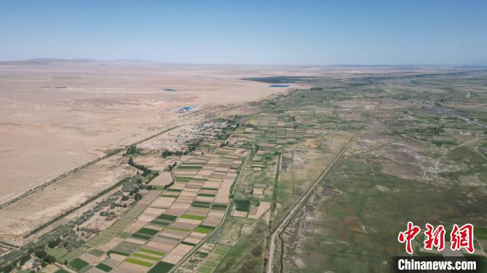5月27日,位于甘肃张掖市高台县黑河湿地保护区的荒漠与湿地共生共美。该保护区南依祁连山国家级自然保护区,北靠巴丹吉林沙漠,处于河西走廊“蜂腰”地带,是中国西北地区自然保护区网络的重要节点。图为荒漠与湿地和谐共生。(无人机图片) 戴文昌 摄
