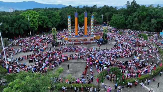 走进目瑙纵歌节现场,第一眼就会被极致壮观的场面狠狠震撼!广场中央,高耸的目瑙示栋图腾柱庄严矗立,绘满民族图腾的柱身,诉说着景颇族迁徙的历史、对自然的敬畏。雄浑的木鼓声、清脆的铓锣声、嘹亮的歌声交织在一起,像是远古的呼唤,瞬间点燃全场的热情。