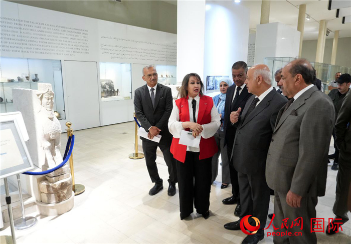 伊拉克文化、旅游和文物部长艾哈迈德·法卡克(右二)参观博物馆。人民网伊纳斯·易卜拉欣摄
