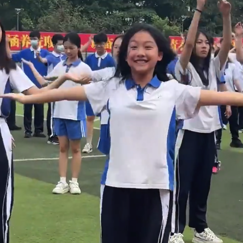 近日,广东一学校学生做课间操,一位女生笑容满面地完成每个动作。