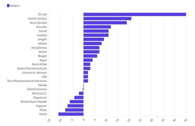 再来看25家制药巨头的正增长情况,如果看环比,似乎只有第一三共和诺华实现了增长,而看同比情况,18家药企实现不同程度的增长,增幅最大的前五家,依次为礼来,第一三共,诺和诺德,诺华和赛诺菲。