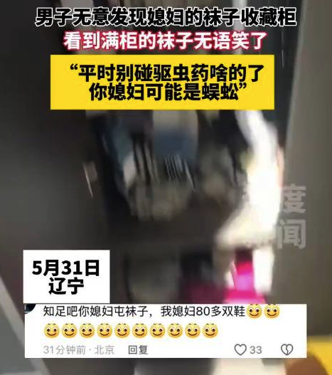 5月31日,辽宁。男子无意发现媳妇的袜子收藏柜,看到满柜的袜子无语笑了,平时别碰驱虫药啥的了,你媳妇可能是蜈蚣允悲。