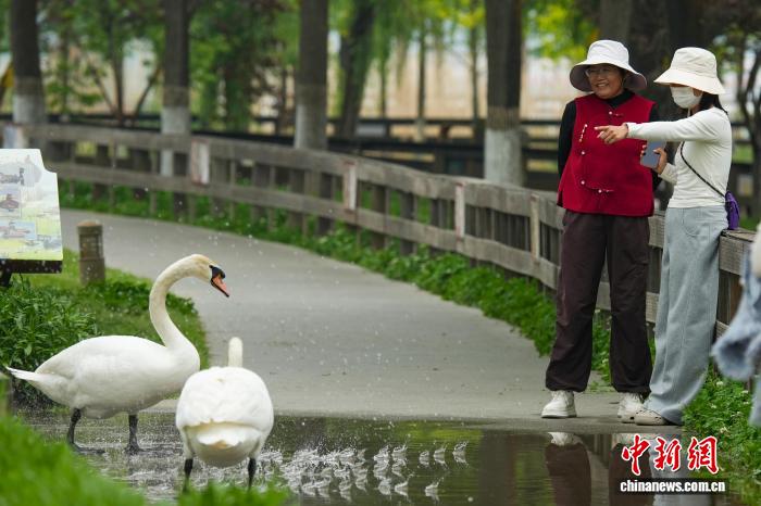 4月16日,河南郑州,随着气温回升,当地疣鼻天鹅进入孵化期。图为郑州北龙湖湿地公园,游客观赏疣鼻天鹅。中新社记者 范晓恒 摄